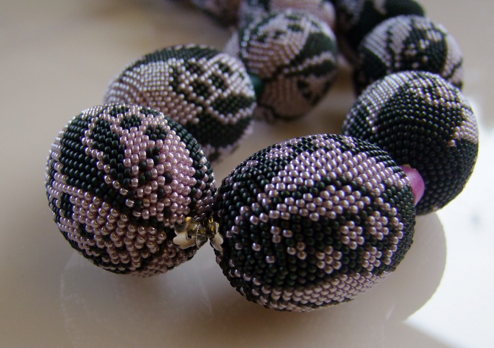 Die 15-seitige Fädelanleitung ist für eine Olive 31 x 25 mm und für Kugeln der Größe 20, 18 und 16 mm mit 15/0er Rocailles und wurde von Birte Jannsen entworfen.