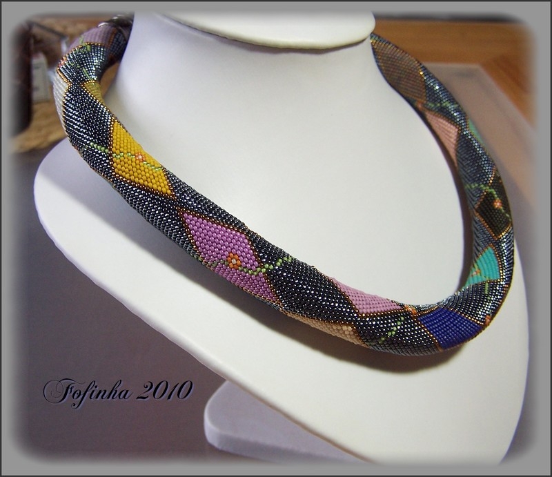 Diese 8-seitige Anleitung ist fĂŒr eine gehĂ€kelte Schlauchkette (LĂ€nge: 49cm ). Es werden 15/0er Rocailles in 15 Farben verarbeitet.