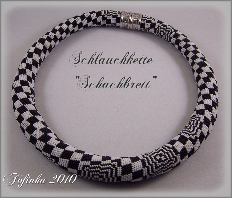 Diese Anleitung ist fĂŒr eine gehĂ€kelte Schlauchkette (LĂ€nge: 50cm und StĂ€rke: 15mm bis 20mm). Es werden 15/0er Rocailles in 2 verschiedenen Farben verarbeitet.